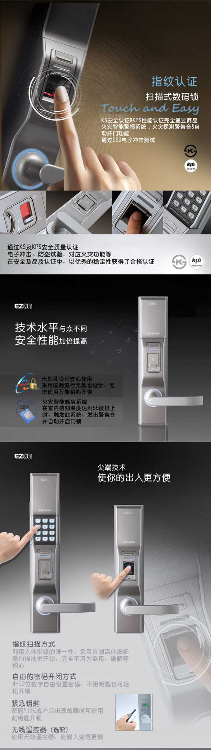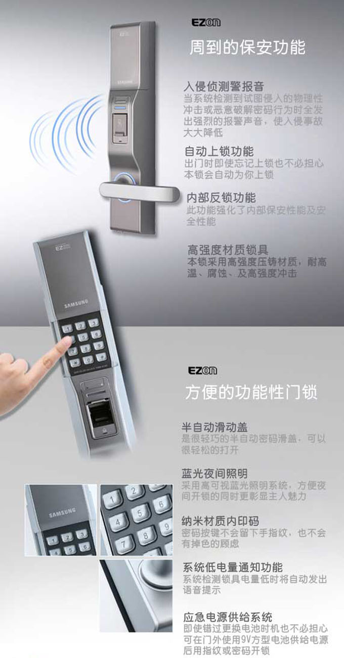現(xiàn)在社會(huì)問題復(fù)雜,門鎖安防性能比較受重視。指紋鎖一般都采用不銹鋼材料鎖舌,但是,大多數(shù)指紋鎖都是單鎖舌,特別是韓國的鎖,更是不適合中國人使用。
