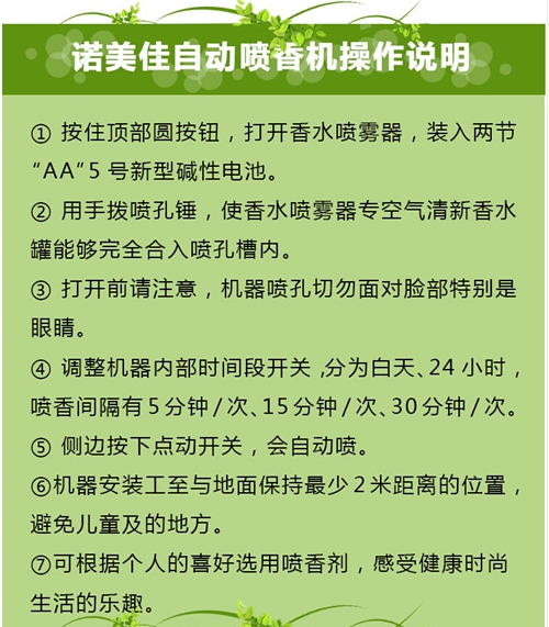 獨(dú)有功能:這款機(jī)器有一個(gè)獨(dú)特的設(shè)計(jì):機(jī)器側(cè)面有一個(gè)白色的圓形按鈕,那個(gè)不是裝飾性的哦,這個(gè)可以按的,手動(dòng)按一下,就會(huì)噴香水出來(lái)了,設(shè)計(jì)的原意是這樣的:很多時(shí)候您可能不需要設(shè)定幾分鐘噴一次,可能您只需要在用完洗手間后噴一次就可以了,這樣您就可以不用設(shè)置定時(shí)噴,只需要按一下那個(gè)白色的按鈕就可以,其他賣家的機(jī)器是沒(méi)有這個(gè)功能的,其他機(jī)器你想讓它噴香,你只能設(shè)置定時(shí)噴,達(dá)不到即時(shí)噴的功能。 能夠驅(qū)蚊驅(qū)蟲(chóng)、凈化空氣、消除 異味、煙味、臭味、提高人們生活 和 工作空間 的空氣質(zhì)量 的自動(dòng)噴香清新空氣設(shè)備,同時(shí)具有殺菌、提神、安神、消除疲勞之功效! 適用場(chǎng)所:星級(jí)酒店、賓館、酒吧、KTV、娛樂(lè)場(chǎng)所、家庭、企事業(yè)單位衛(wèi)生間、客廳、臥室、辦公室、影樓、spa會(huì)所、服裝店、鞋店、贈(zèng)品、候車室、會(huì)議室、大廳、醫(yī)院、網(wǎng)吧等人口密集或需要增添清香的地方。